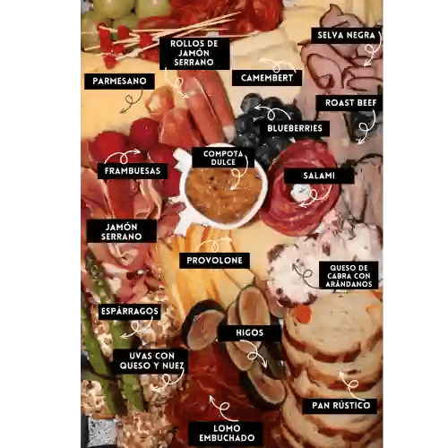 Aprox 530g: lomo, salame, chorizo pamplona, uvas envueltas, blueberry, roast beef, selva negra, queso: cabra, camembert, parmesan, provolone, gouda.